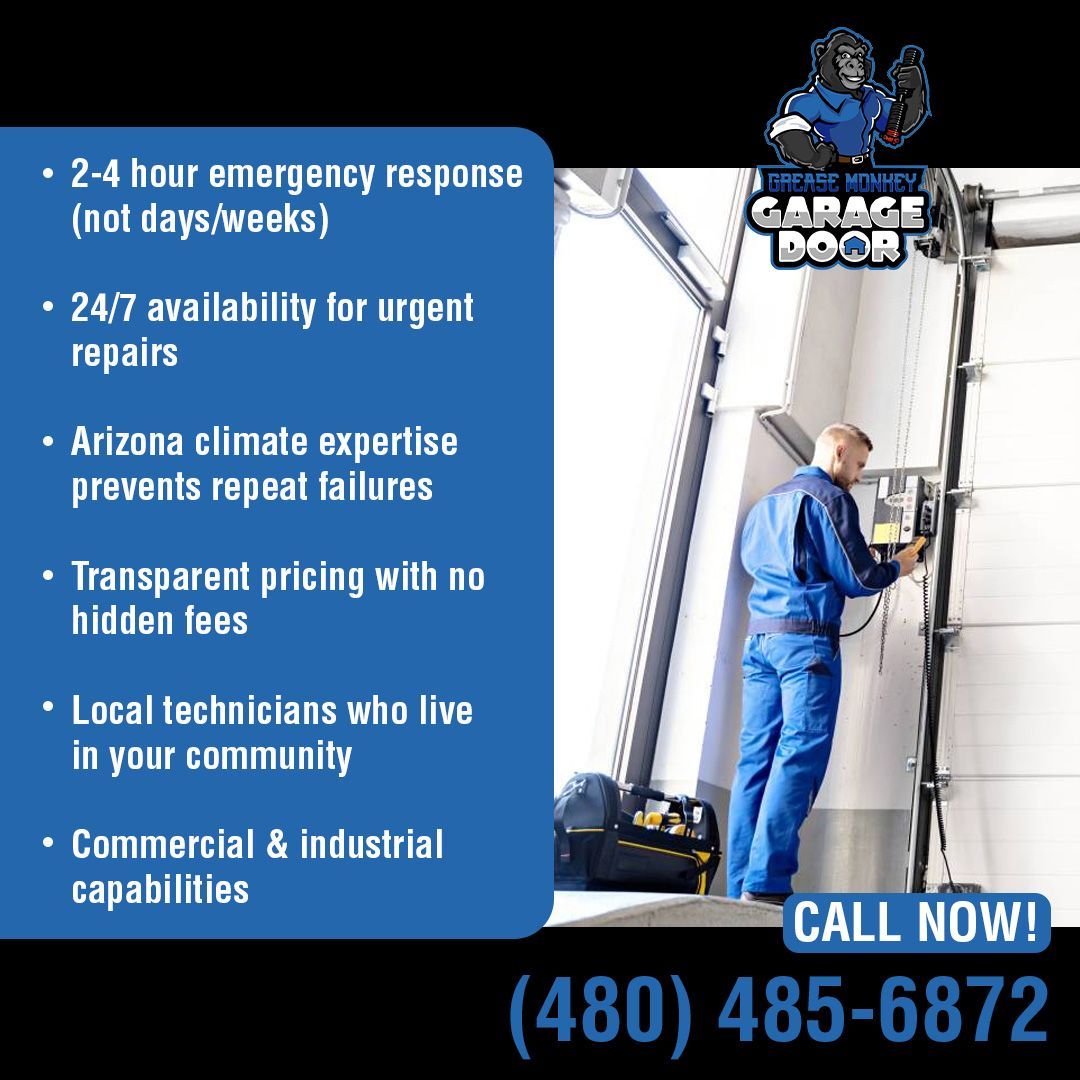 commercial garage door repair in Gilbert, Florence, and surrounding areas, response time becomes even more important. Every hour your loading dock or storefront remains inoperable costs your business money in lost productivity and delayed operations. Schedule your service now with Grease Monkey Garage Door to keep your doors and your business running smoothly.