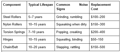 - Most noise comes from worn rollers and dry parts - Steel rollers without proper bearings and components lacking lubrication create the majority of garage door sounds. Regular maintenance every 6 months can prevent these issues and extend component life.